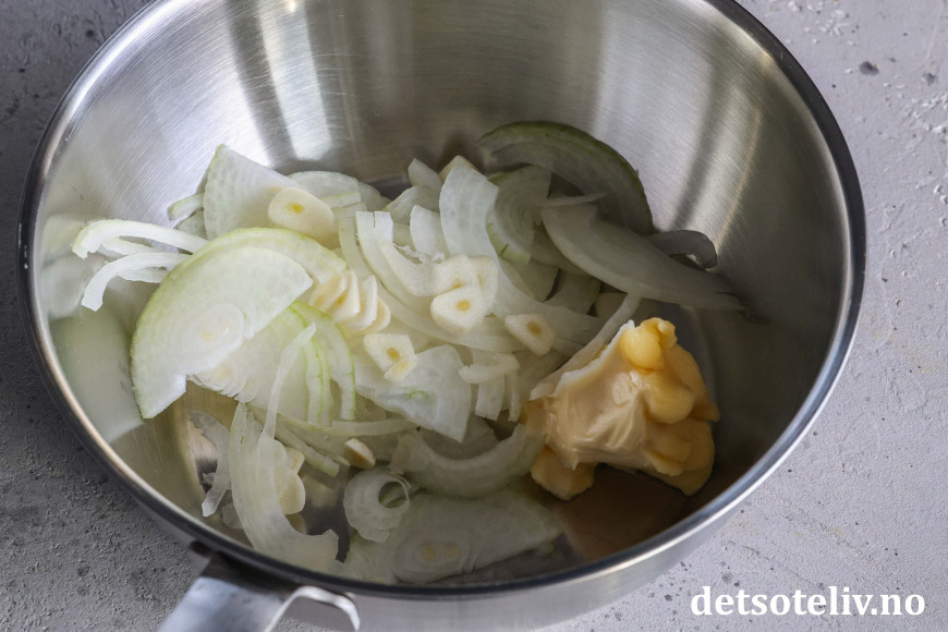 Ha smøret i en kjele. Skjær en halv løk og to hvitløksfedd i tynne skiver og ha dette i kjelen.