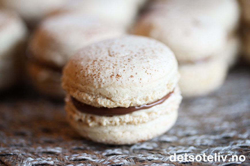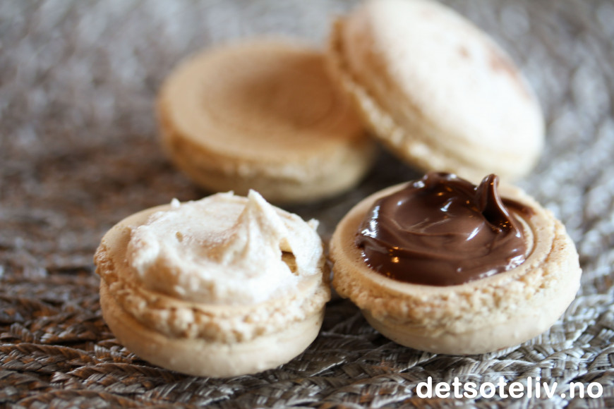 Dette tror jeg er de beste franske makronene jeg har laget hittil. Jeg har fylt dem med en vanilje- og kaffesmørkrem og i tillegg sjokolade- og nøttepålegget Nutella. Det går så klart å velge bare en av delene, men kombinasjonen av begge typer fyll smakte helt fantastisk!