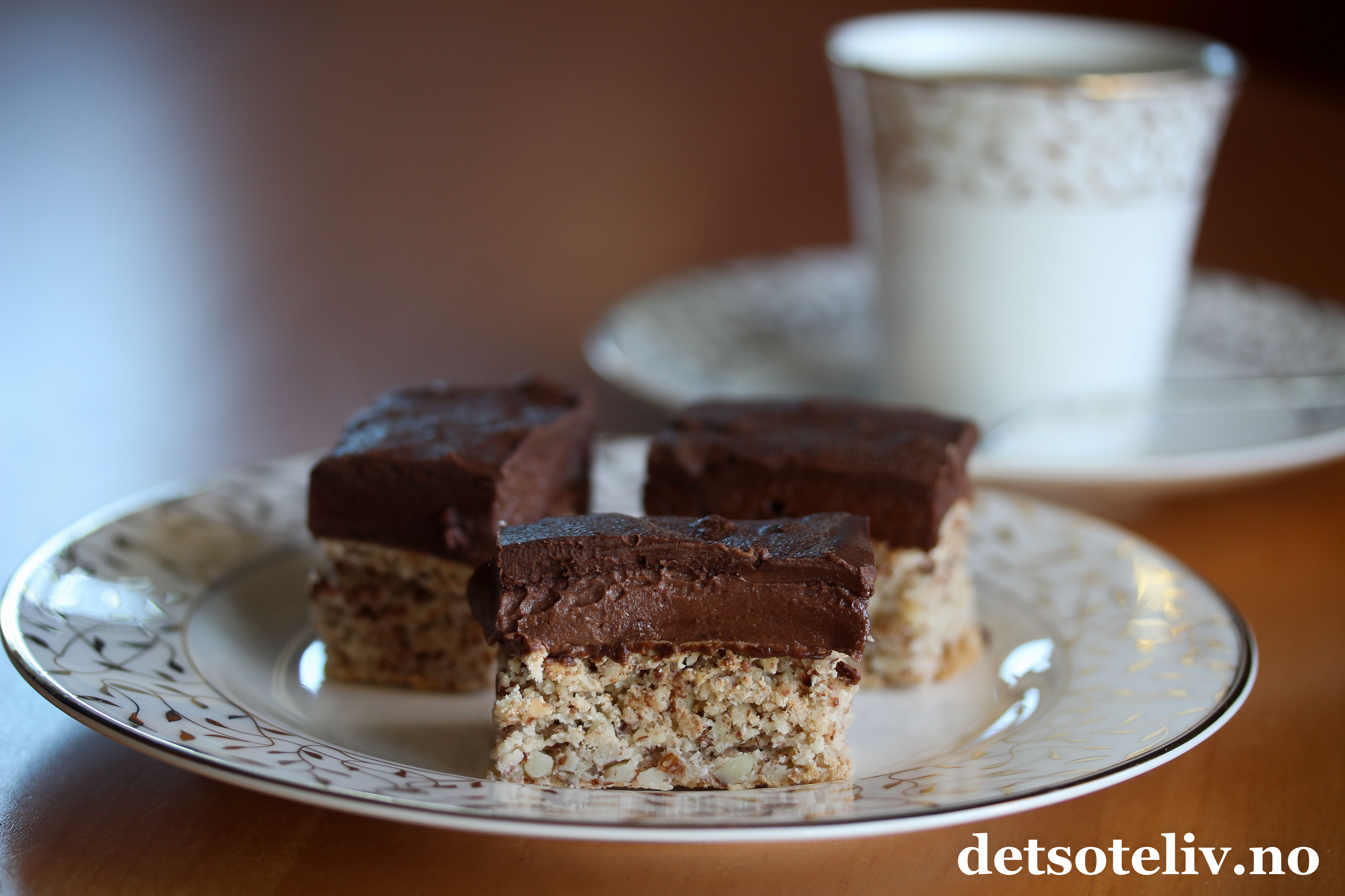 Kaken består av en myk nøttebunn, fyldig sjokoladesmørkrem og lekker, mørk sjokoladeglasur. Kaken er fin å fryse og tiner raskt, så den er ideell å lage i forveien og ha på lur i fryseren til uventet besøk eller en annen festlig anledning!
