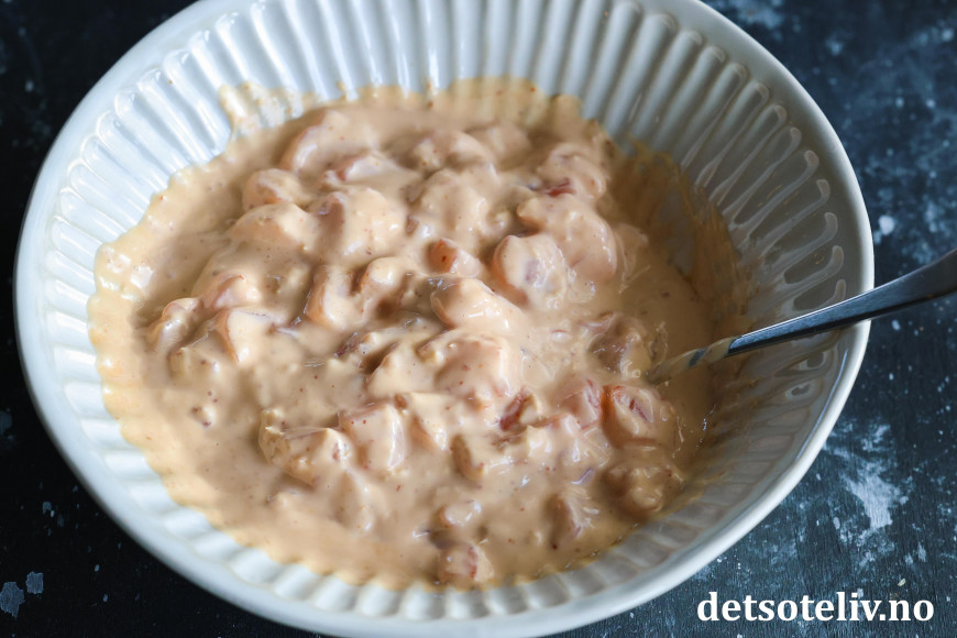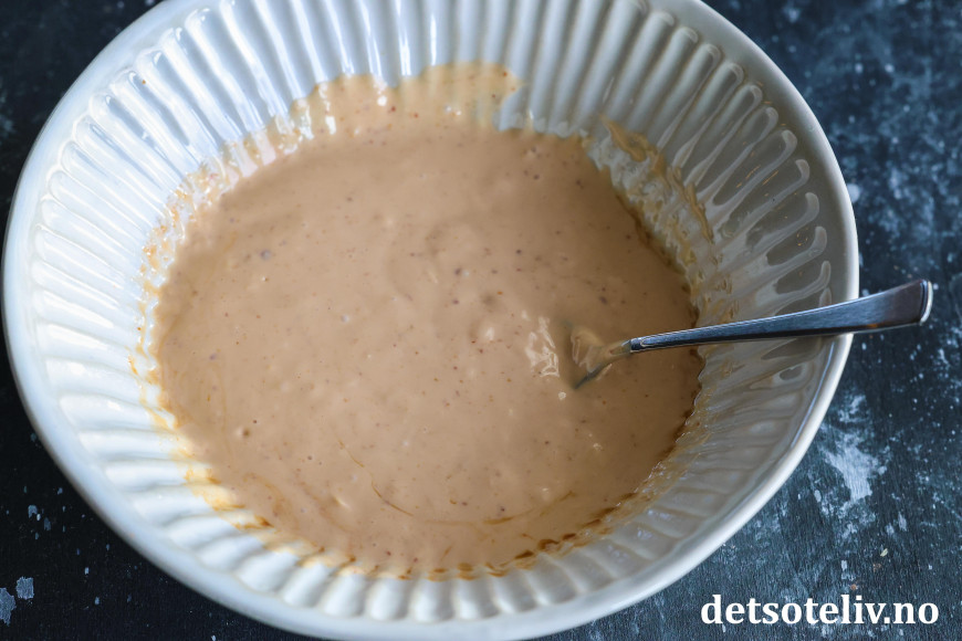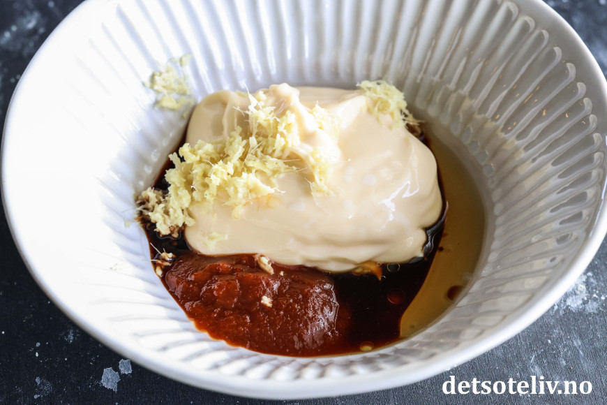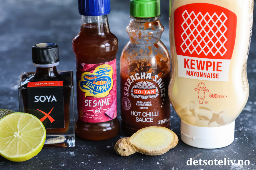 Rør majones sammen med sriracha, soyasaus, sesamolje, revet ingefær og litt limesaft.