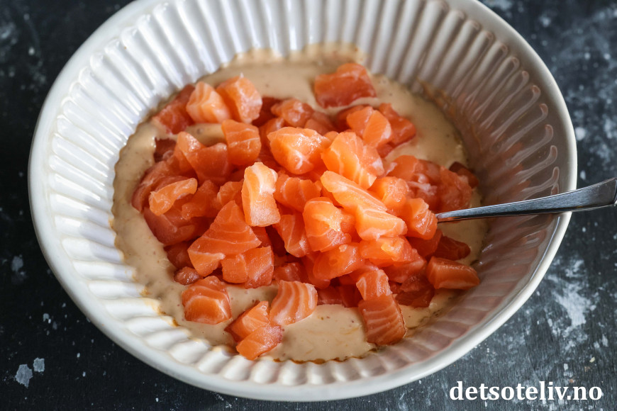 Rør majones sammen med sriracha, soyasaus, sesamolje, revet ingefær og litt limesaft. Vend laksebitene i chilimajonesen og sett i kjøleskapet i 30 minutter, slik at laksen blir godt marinert.
