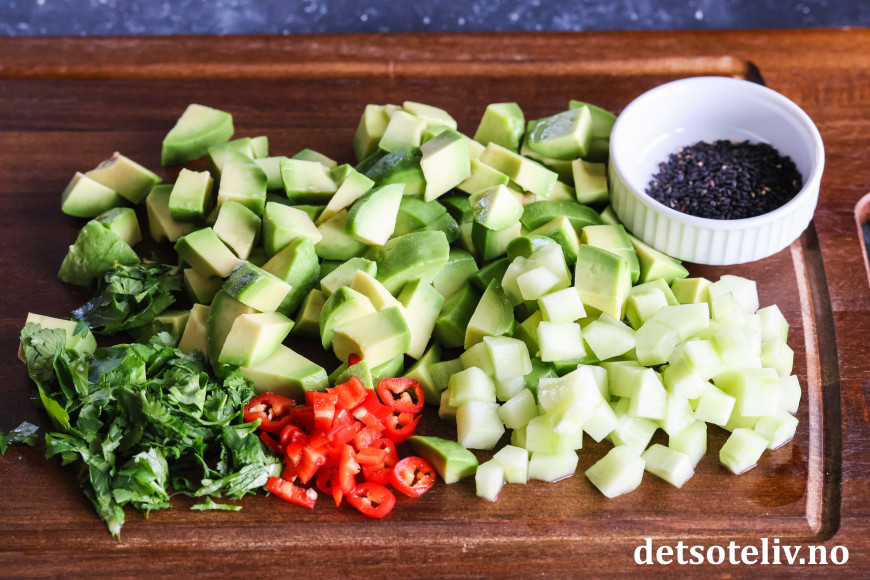 Kutt agurk, avokado og vårløk i små biter. Skjær chili i tynne skiver.