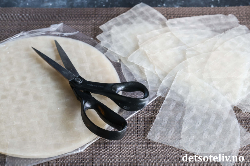 Legg små hendige biter av rispapir utover serveringsfat slik at de er klare til å fylles rett før servering.