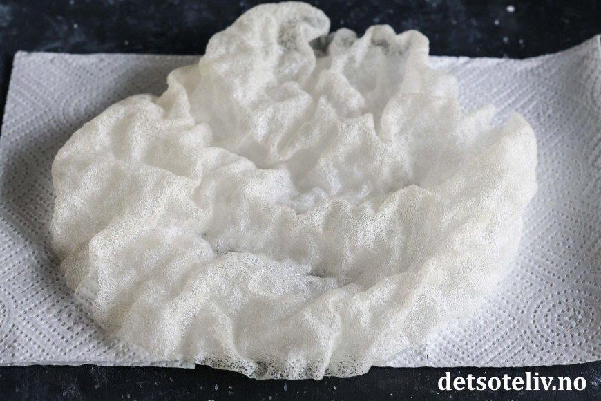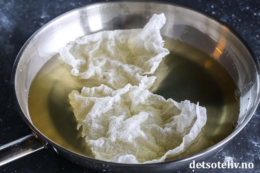Steketiden til rispapiret skal være kun et par sekunder. Løft det friterte rispapiret ut av oljen (jeg bruker et par gafler til dette) og legg det på et stykke kjøkkenpapir slik at overflødig olje kan renne av rispapiret.