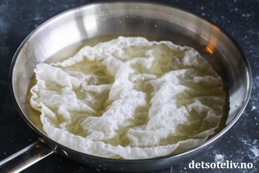 ♥ Det kan være greit å bruke et steketermometer for å sjekke varmen på oljen. Har du ikke termometer, vil du likevel kunne prøve deg frem på varmen med et lite stykke rispapir. Oljen er varm nok når rispapir straks puffer seg opp når det kommer i kontakt med oljen (blir rispapiret liggende rolig i oljen, er ikke oljen varm nok).