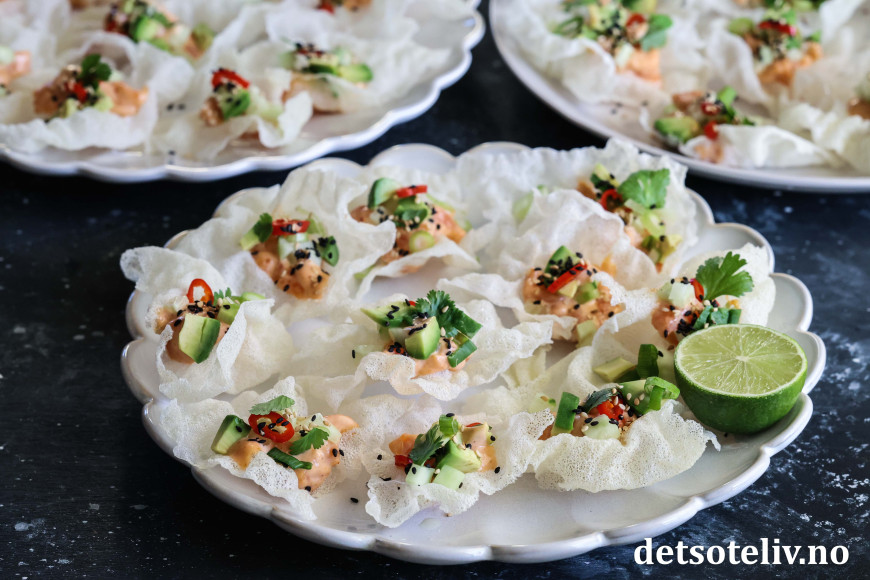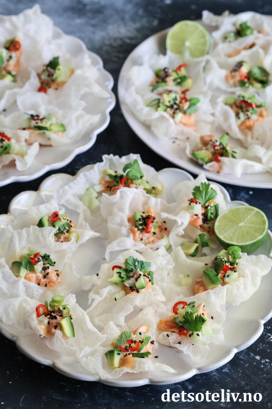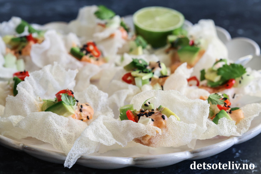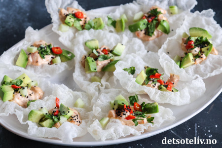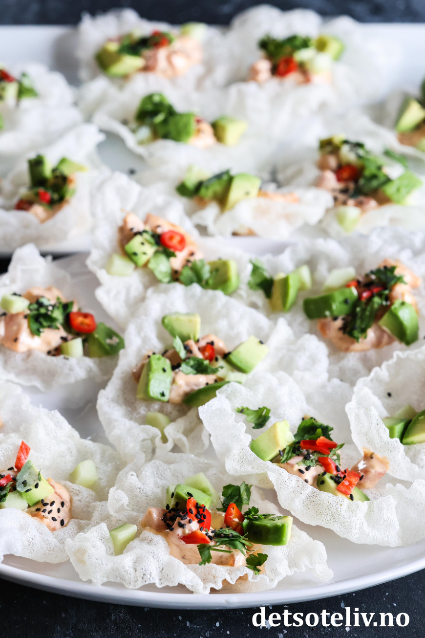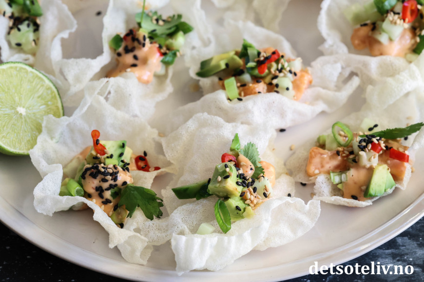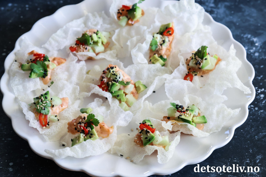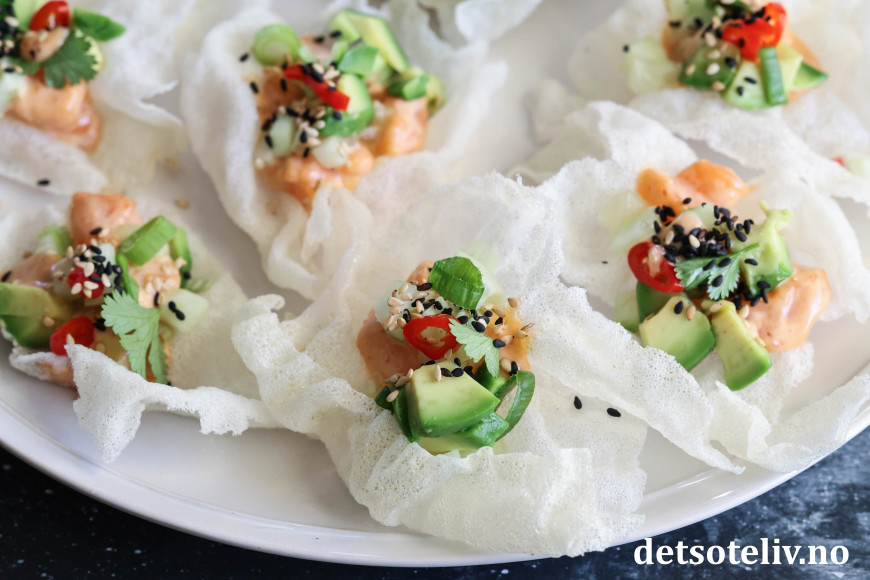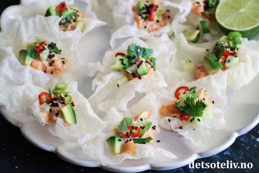 Jeg har toppet de sprø rispapirbitene med en spicy lakserøre. Lakserøren lages av rå sashimilaks i små terninger, som marineres i en digg chilimajones smaksatt med sriracha, soyasaus, sesamolje, litt revet ingefær og limesaft. I tillegg topper jeg med agurk, avokado og vårløk i små biter. Pynt med litt chili, koriander og sesamfrø.