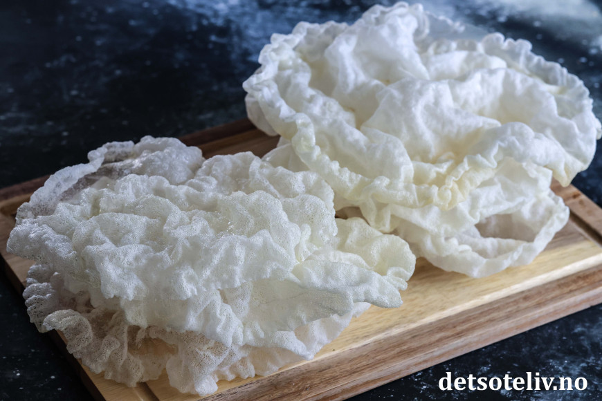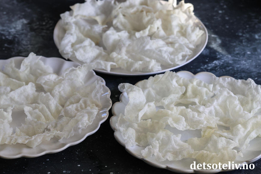♥ Regn med noe svinn når du lager de friterte rispapirene. Det er normalt at noen går litt for mye i stykker når du brekker dem opp. Flakene du bruker til å legge fyll på bør gjerne ha en grop som gjør det lett å holde fyllet på plass.