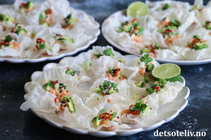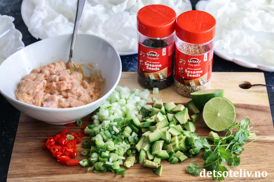 ♥ Lakserøren og toppingen kan lages klart flere timer før servering. Dekk til med plastfolie og oppbevar i kjøleskapet. Rispapirene kan friteres før gjestene kommer, men bør ikke bli stående for lenge fordi de da mister noe av sprøheten. Rispapirene må fylles rett før servering fordi fyllet vil gjøre rispapiret bløtt hvis det står for lenge.