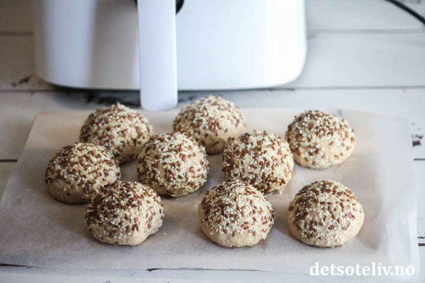 Plasser deretter inn rundstykkene (til Cosori airfryer er det perfekt plass til 9 rundstykker).