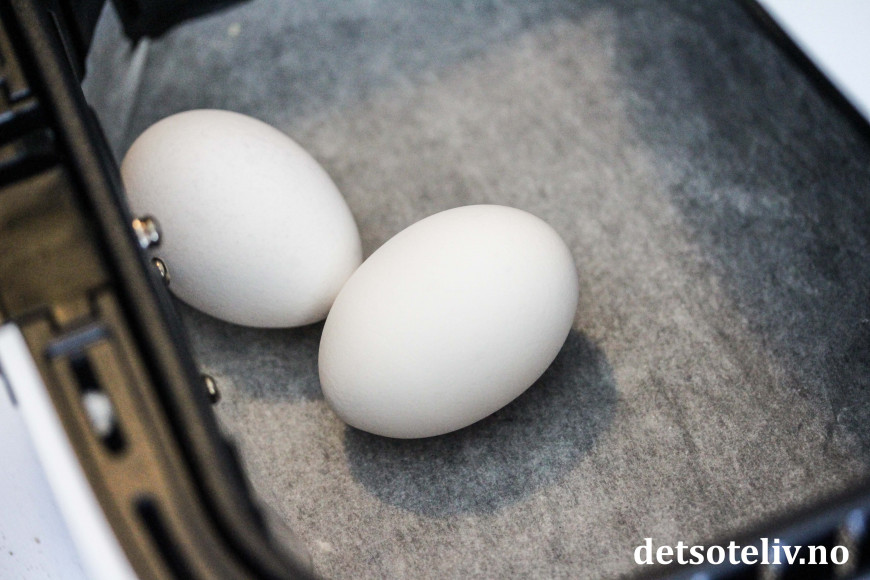 Jeg forvarmer airfryeren på 150°C i 5 minutter. Legg eggene så rett i kurven på airfryeren.
