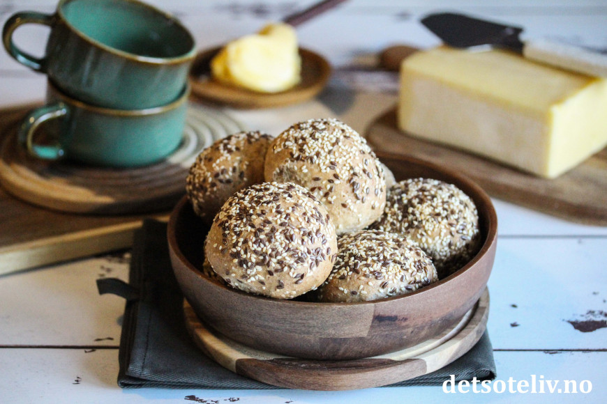 Jeg har her laget halvgrove rundstykker som er perfekt egnet til frokost, og også til lunsj eller til å ha med seg ut på tur senere på dagen.