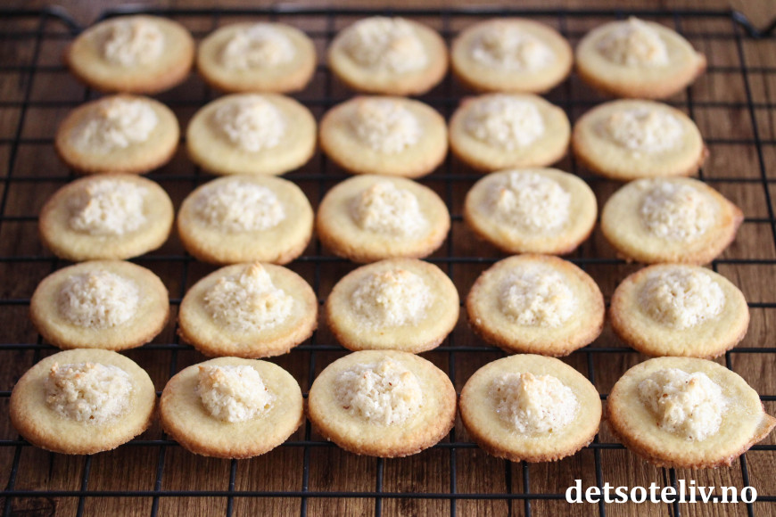 Stek kakene midt i ovnen ved 200°C i ca. 10 minutter. Avkjøl kakene litt på platen før de forsiktig flyttes over på rist og avkjøles helt.