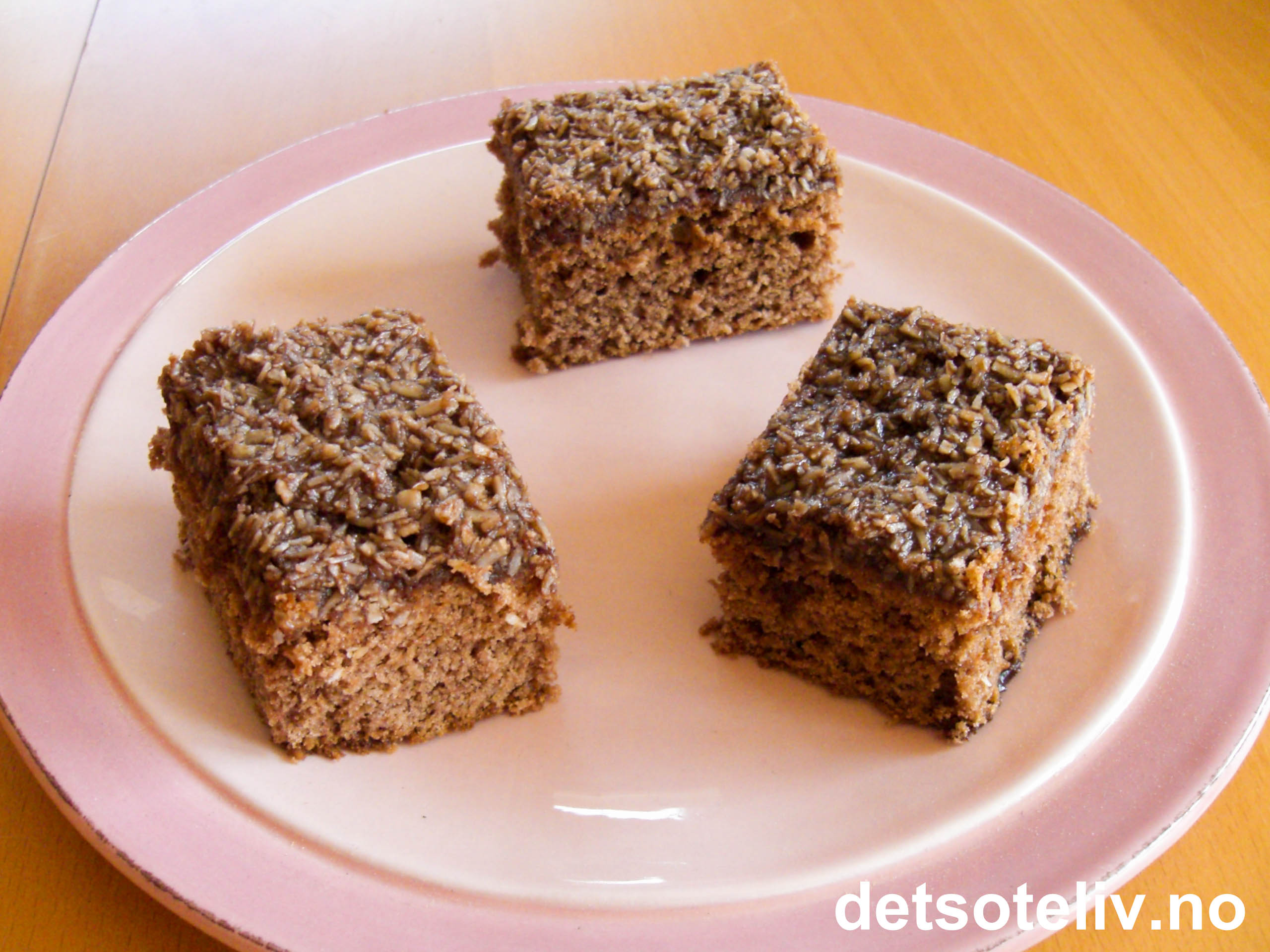 Hell deigen i en liten, bakepapirkledd langpanne (ca 20x30 cm). Stek kaken på rist midt i ovnen ved 200°C i 25-30 min. Avkjøl kaken i formen. Ta den ut av formen og fjern bakepapiret.