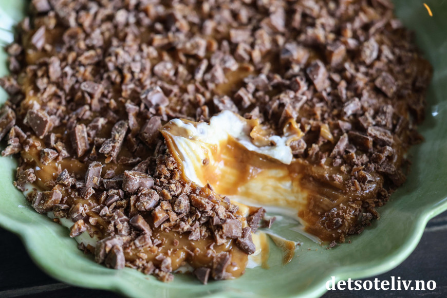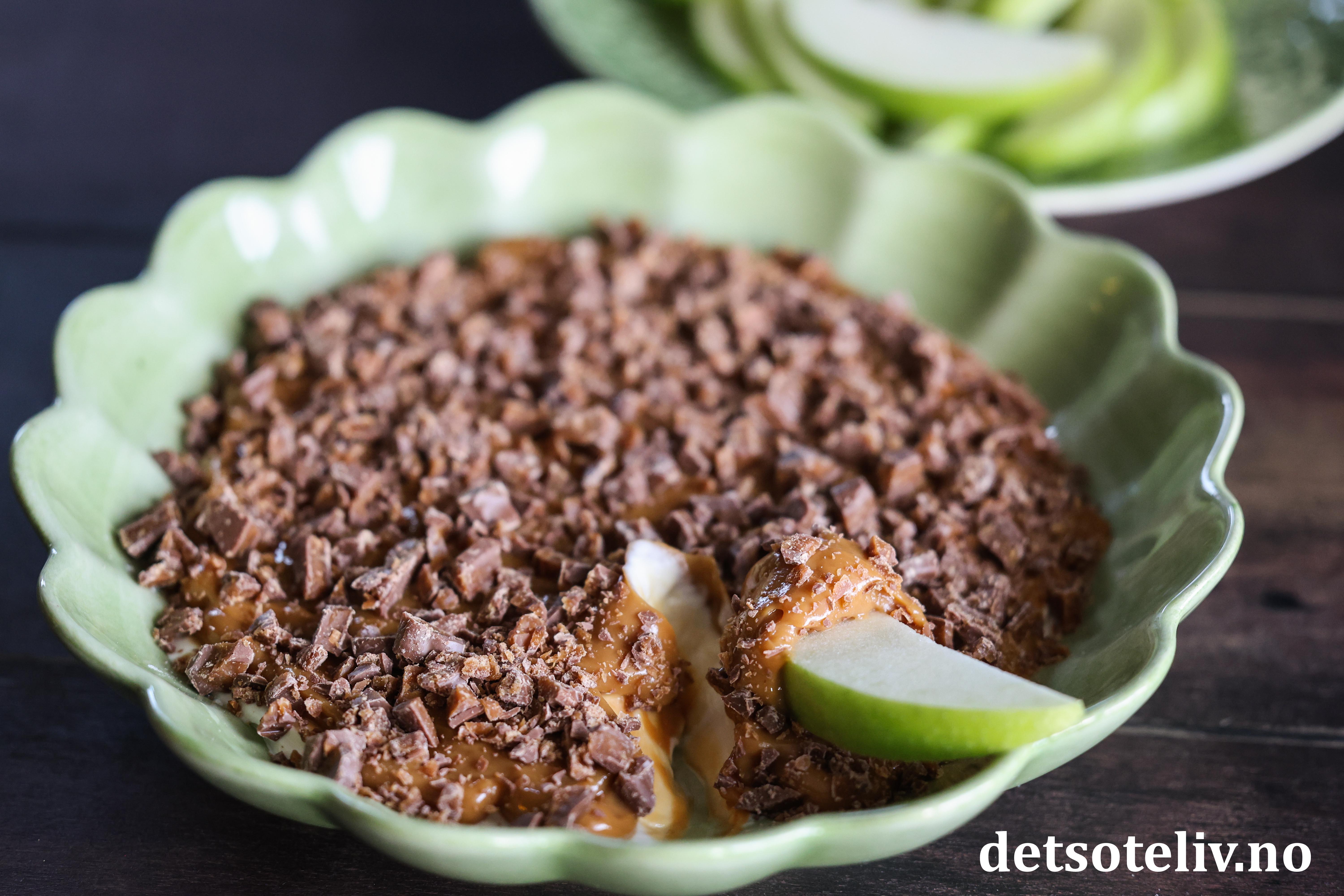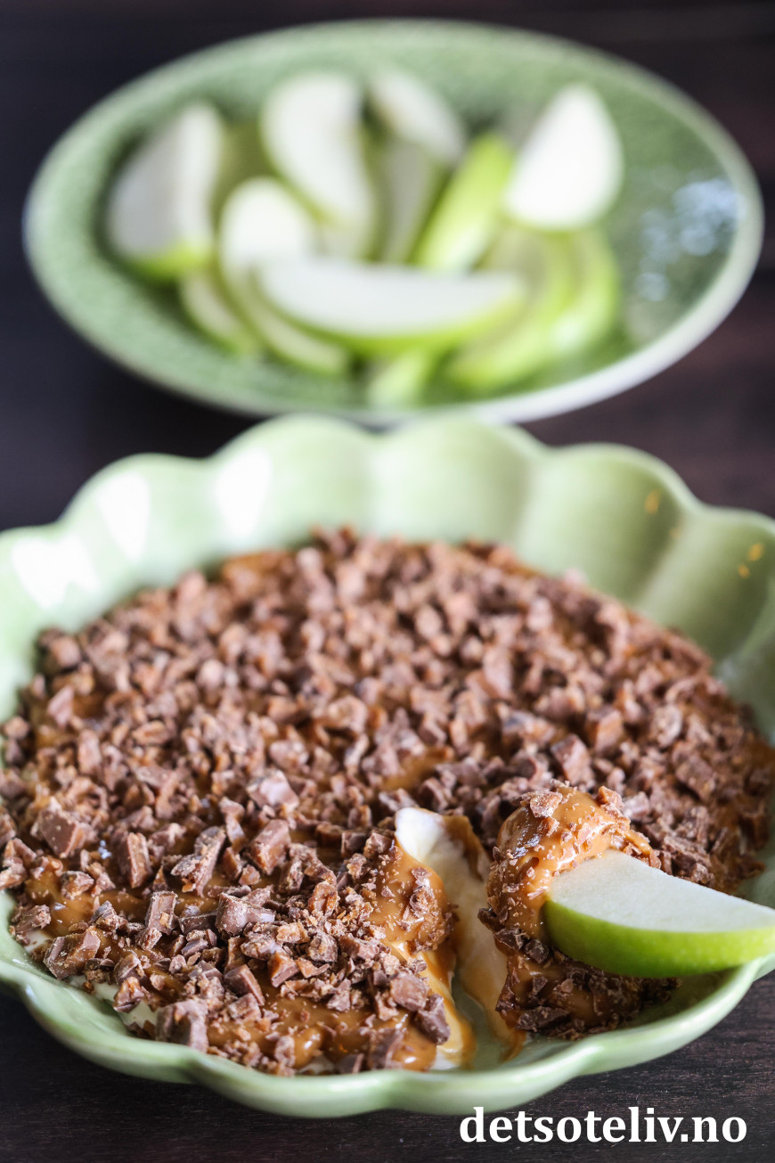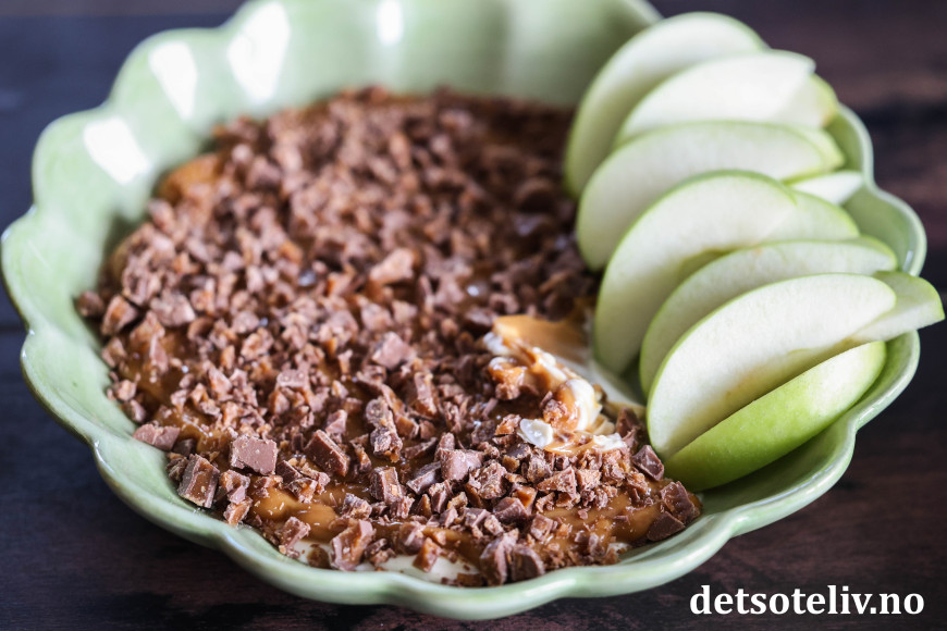 Her er det crispy, grønne eplebåter som dyppes i en kjempegod kremostdipp. Som karamell brukes Dulce de leche, enten ferdigkjøpt (se tips) eller hjemmelaget (se oppskrift HER). Dippen toppes med hakket Daim, som gir deilig crunch.