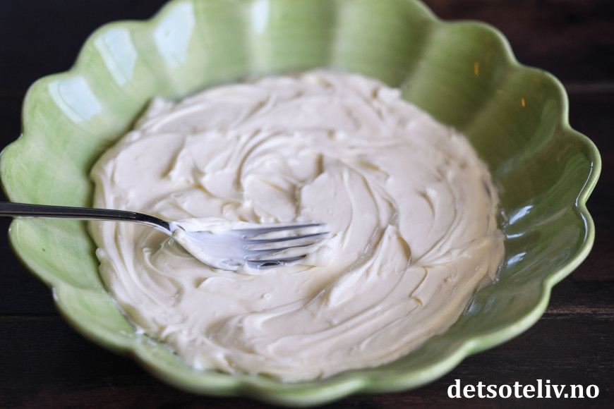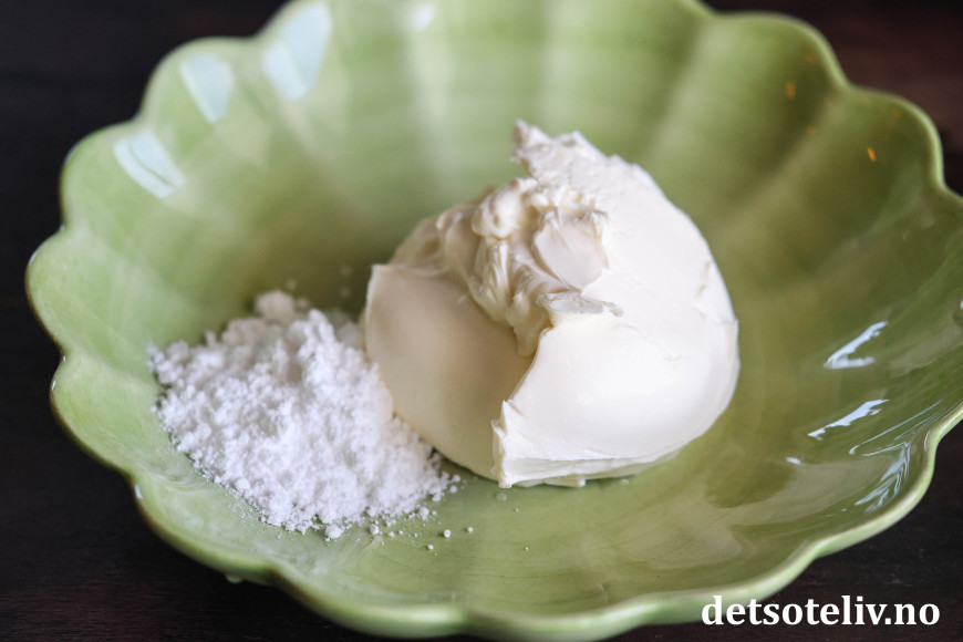 Ha kremost og melis på en liten tallerken. Bland dette sammen og smør kremosten utover tallerkenen.