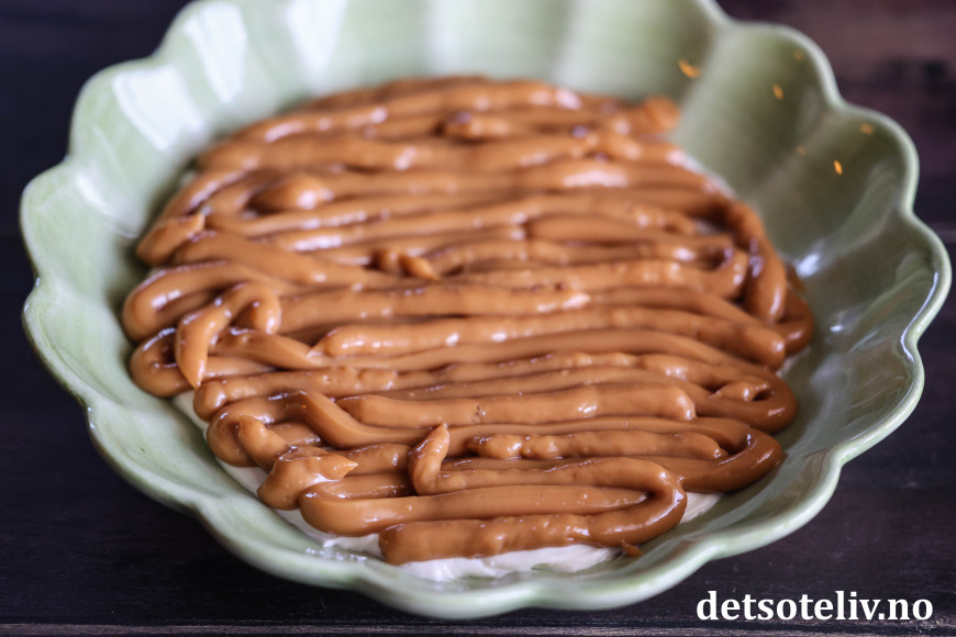 Ha dulce de leche i en sprøytepose og sprøyt den utover kremosten. Jevn til overflaten. (Karamellkremen kan også smøres over kremosten med en kniv).