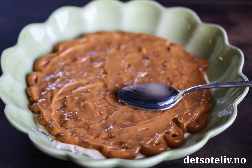 (Karamellkremen kan også smøres over kremosten med en kniv.)