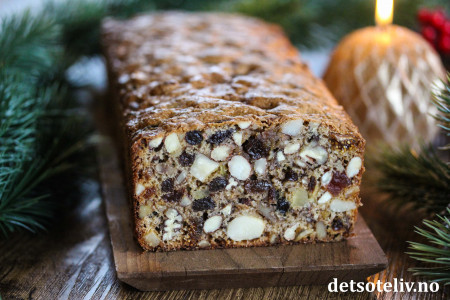 Fruktkake med dadler er en veldig god, tung og fyldig fruktkake som inneholder mye nøtter og tørket frukt av den spennende sorten, slik som paranøtter, dadler, fiken og aprikoser.