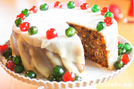 Det er ikke nødvendig å dekke fruktkaken med marsipan, se "Fruktkake fra Betlehem" som er basert på liknende oppskrift, men uten pynt.