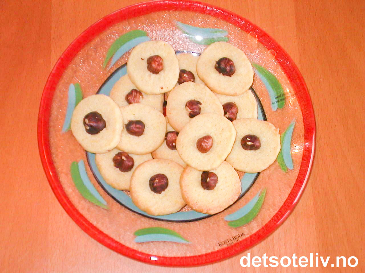 Del hasselnøttene i to. Press en halv nøtt godt ned i midten på hver kake. Stek kakene midt i ovnen ved 200°C i 10 min. Avkjøles på rist.
