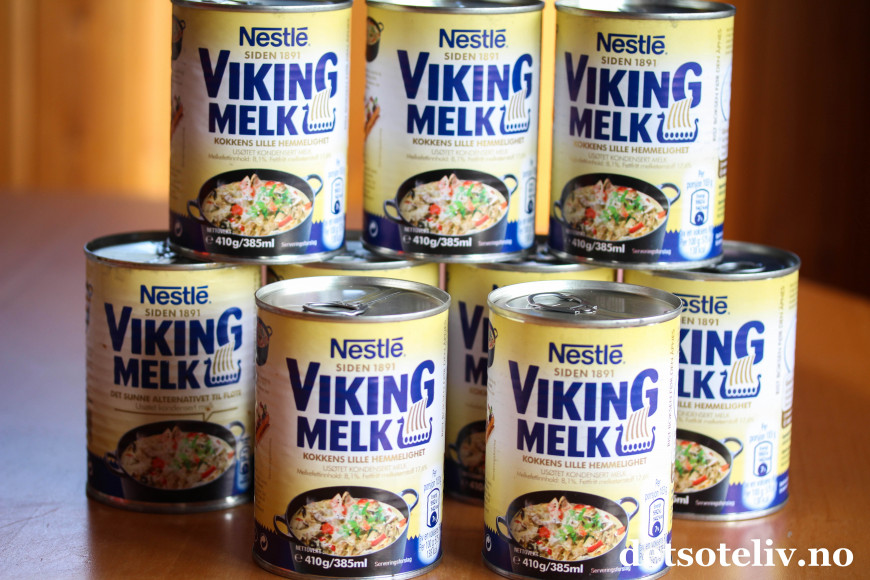 ♥ Det er viktig å skille Vikingmelk fra søt kondensert melk. Begge deler selges på hermetikkboks, men konsistensen er helt forskjellig. Her brukes altså Vikingmelk, som er usøtet, og som er nesten som vanlig melk i konsistenen (bare litt mer konsentrert). Vikingmelk fås kjøpt i de fleste matbutikkene i Norge.