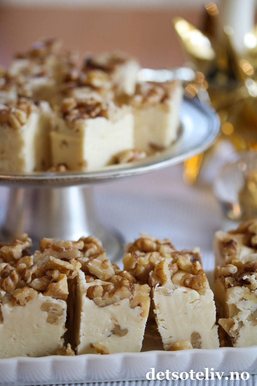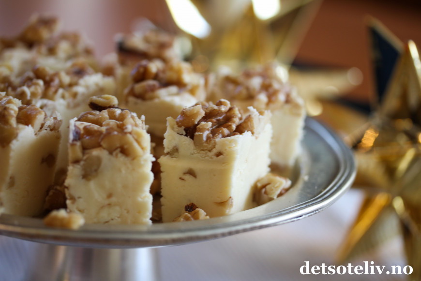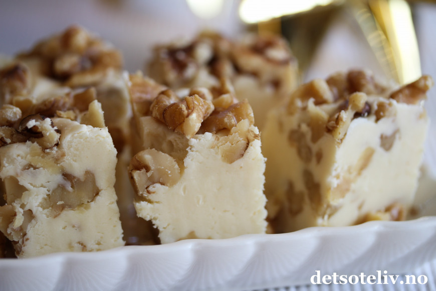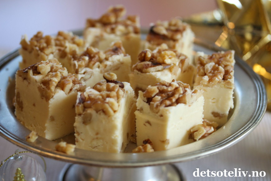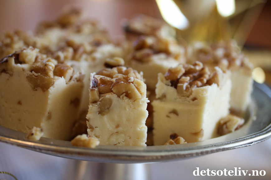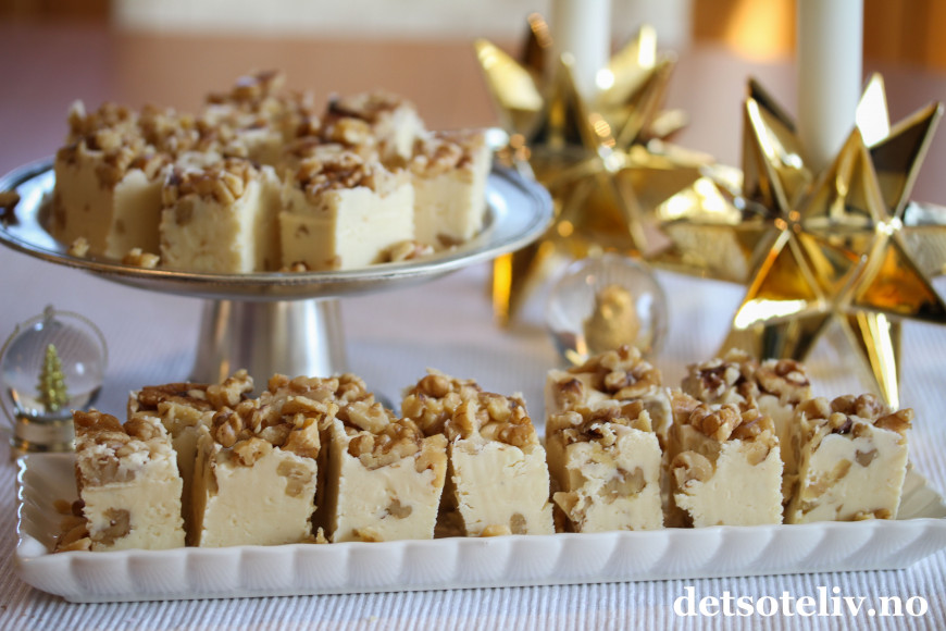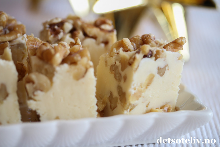 Fudge kan lages på ulike måter. Denne her lages med vikingmelk (usøtet, kondensert melk) og marshmallowskrem. Du kan også bruke smeltede marshmallows. Smaken kommer av ekte vanilje, hvit sjokolade og masse, hakkede valnøtter.