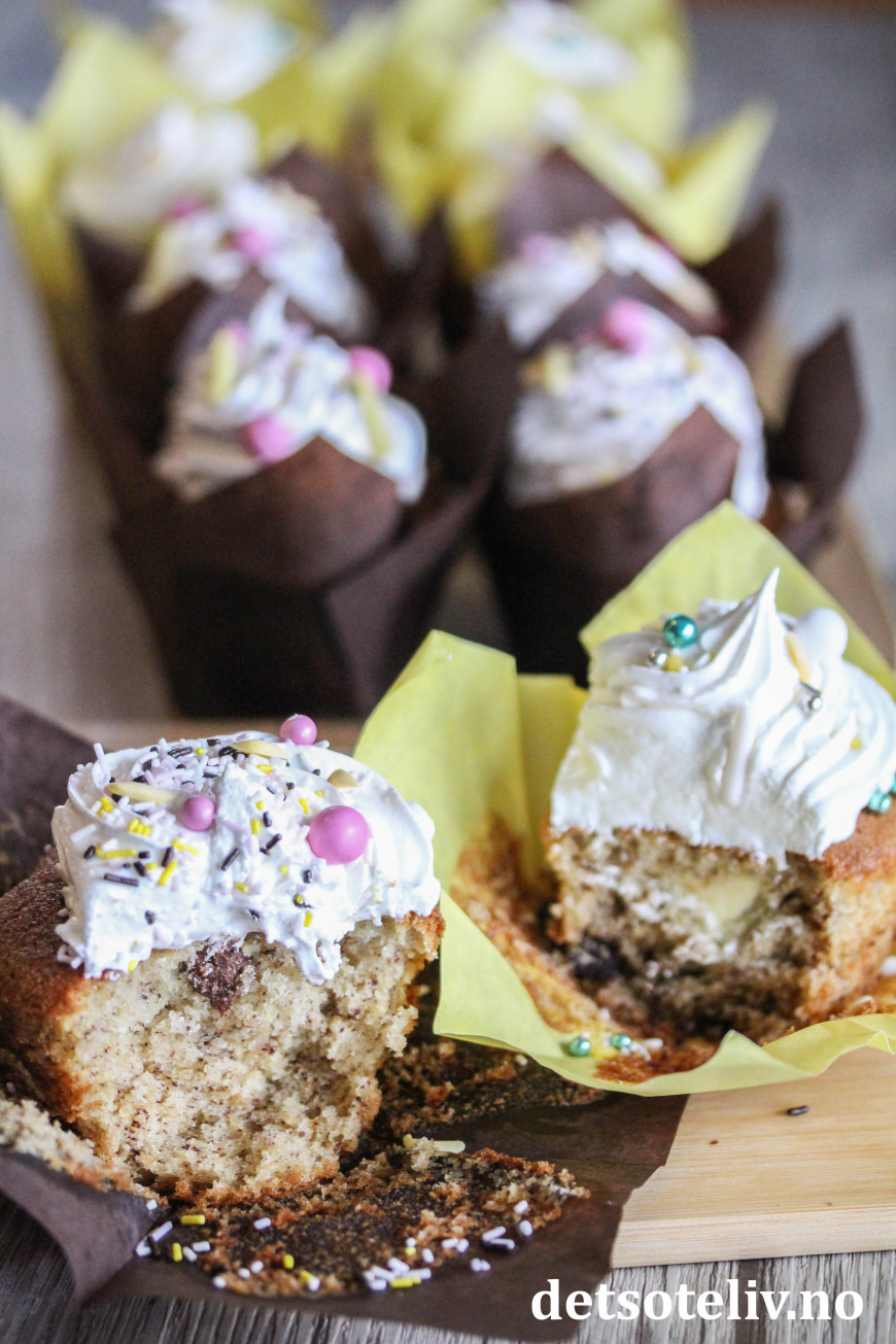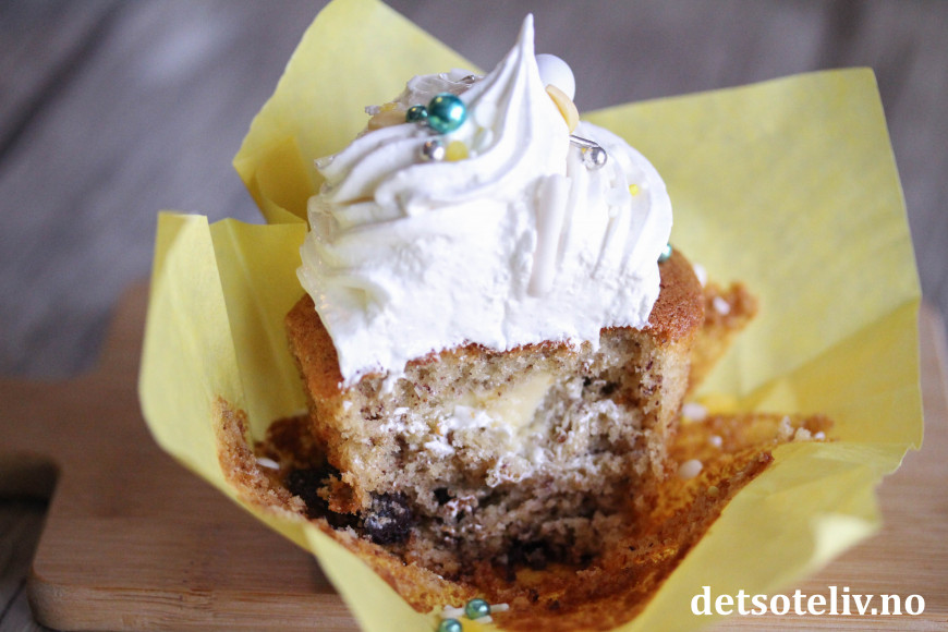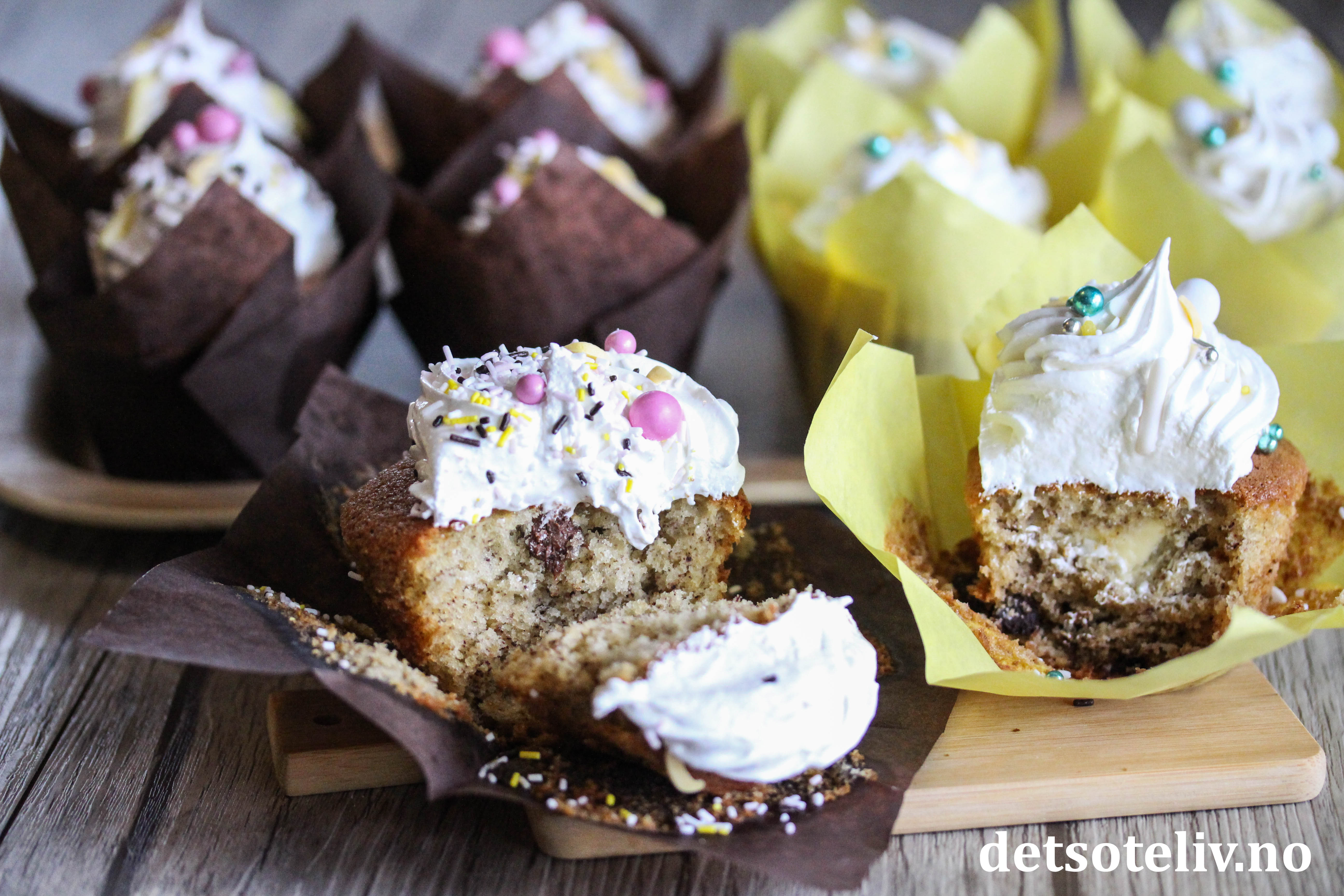De gule formene er bananmuffins med sjokoladebiter, fylt med vaniljekrem.