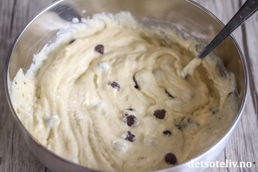 Jeg blandet chocolate chips i halvparten av deigen, men det er ikke nødvendig.
