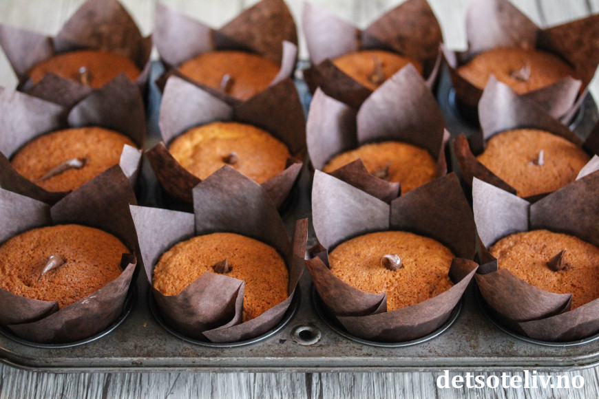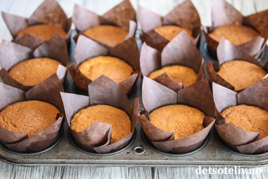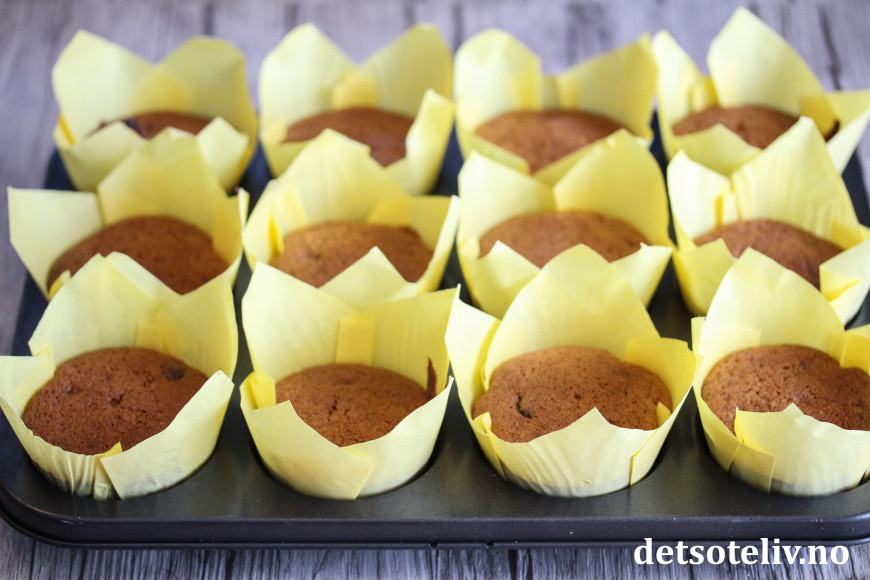 Sett papirformer i muffinsbrett. Jeg brukte disse lekre formene i gult og brunt (se tips). Fordel deigen i formene så de blir ca. 2/3 fulle.