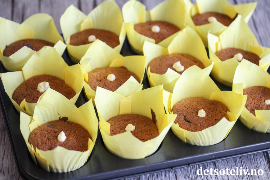 Stek muffinsene på rist midt i ovnen ved 175°C i ca. 35-40 minutter eller til de er gyllenbrune i fargen.