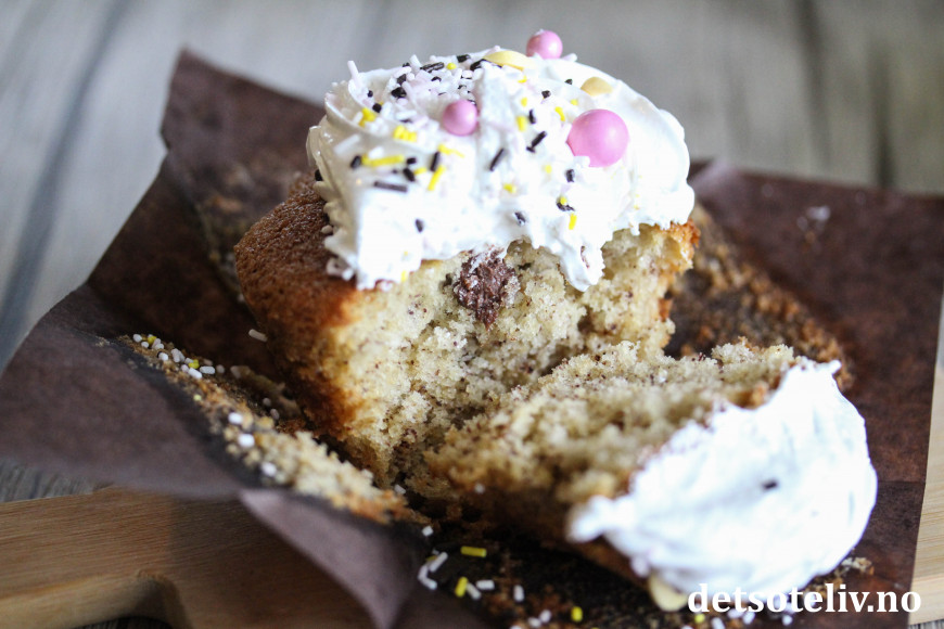 Jeg har laget saftige bananmuffins, der jeg blandet sjokolade i halvparten av deigen. De ferdigstekte muffinsene fylte jeg dels med Nutella og dels vaniljekrem.