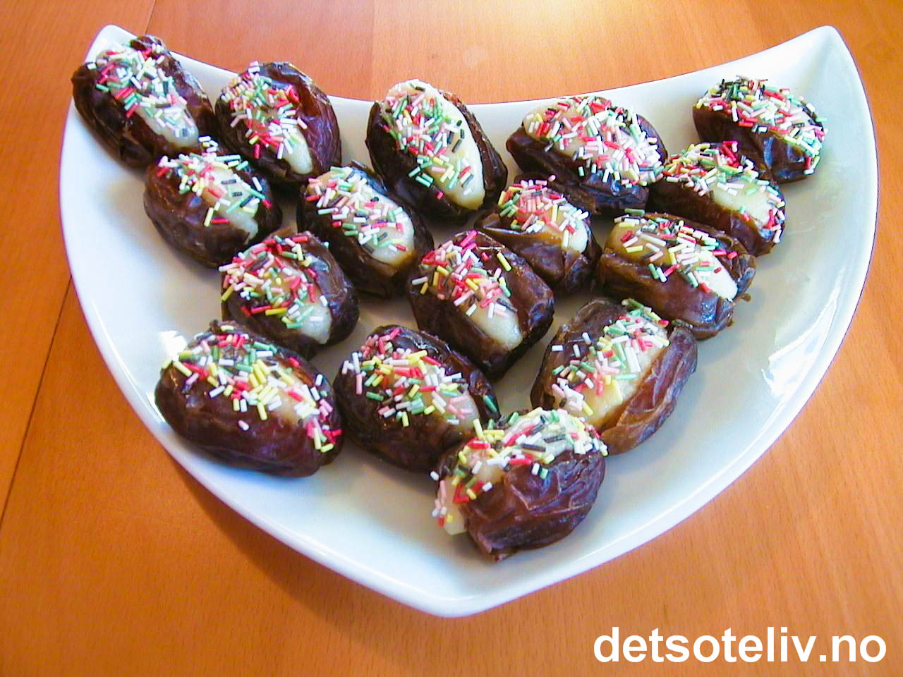 Alternativ pynt kan være å dyppe den ene halvdelen av de fylte dadlene i smeltet kokesjokolade. Beregn da 100 g kokesjokolade til denne porsjonen.