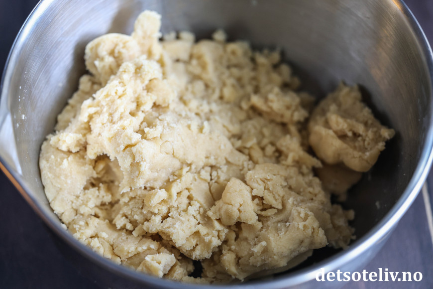 Tilsett mykt smør i klatter og kjør videre til du ser at smøret har smuldret seg fint sammen med det tørre.