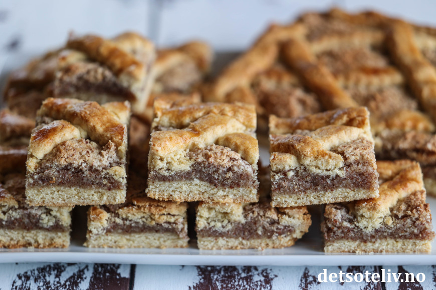 ♥ Bruk melis på bakebordet i stedet for hvetemel når du kjevler ut remsene for å unngå at mørdeigen blir hard. Bruk en stekespade når du forsiktig løfter remsene fra bakebordet til kaken. Likevel hender det at de går i stykker. Da er det bare å lappe dem sammen på kaken. Det gir kaken bare et sjarmerende og hjemmelaget preg!
