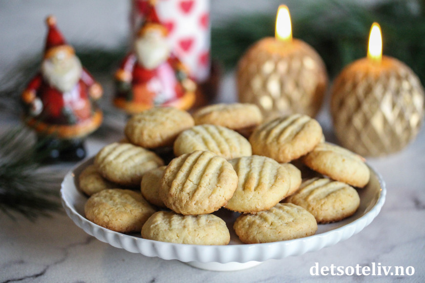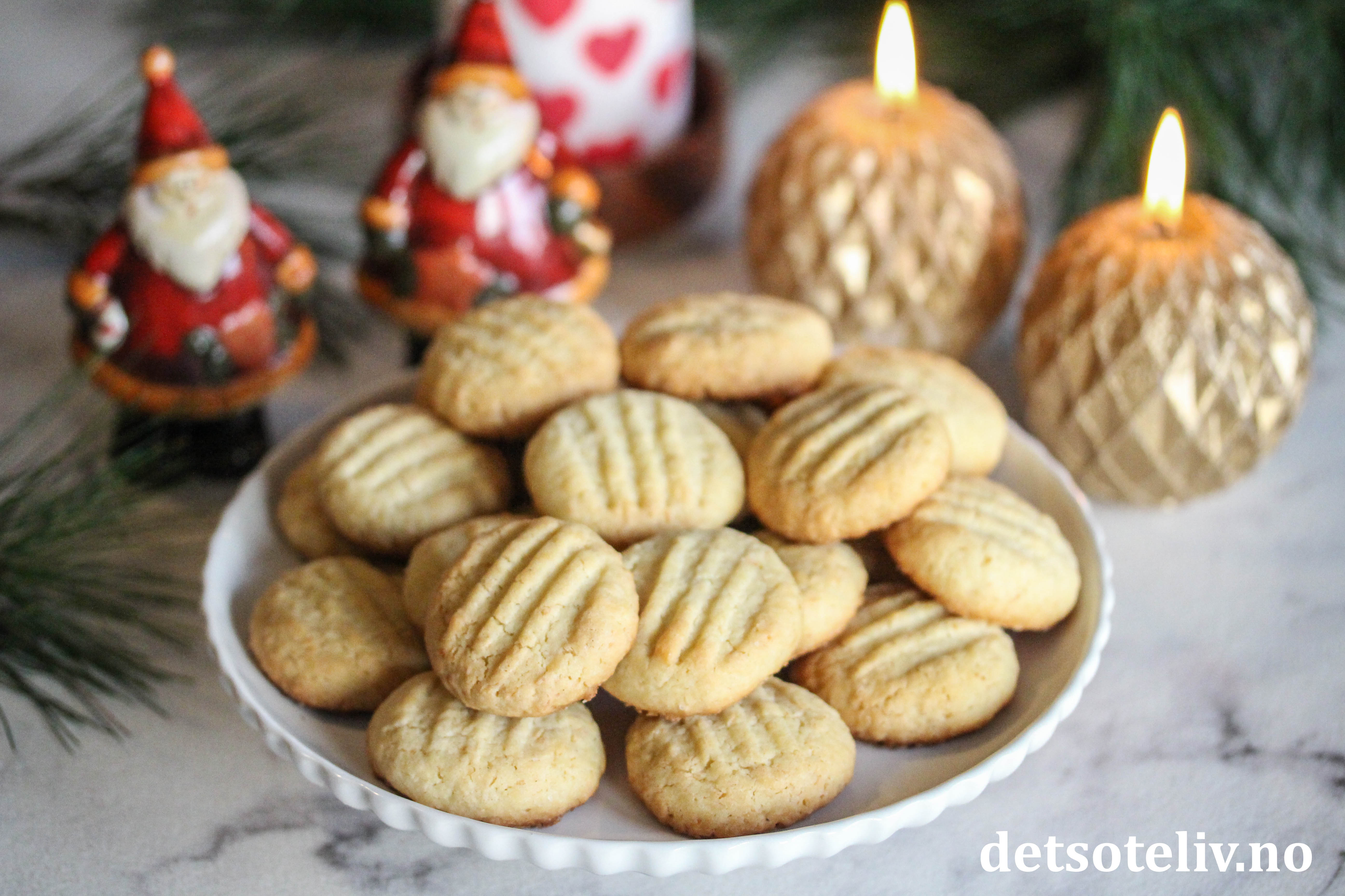 Del deigen opp i 30 jevnstore biter. Trill bitene til kuler. Ha kulene på stekeplate som er dekket med bakepapir. Trykk kakene flate med en gaffel.