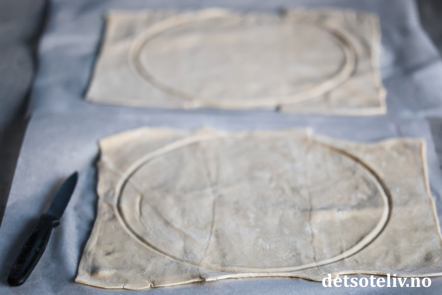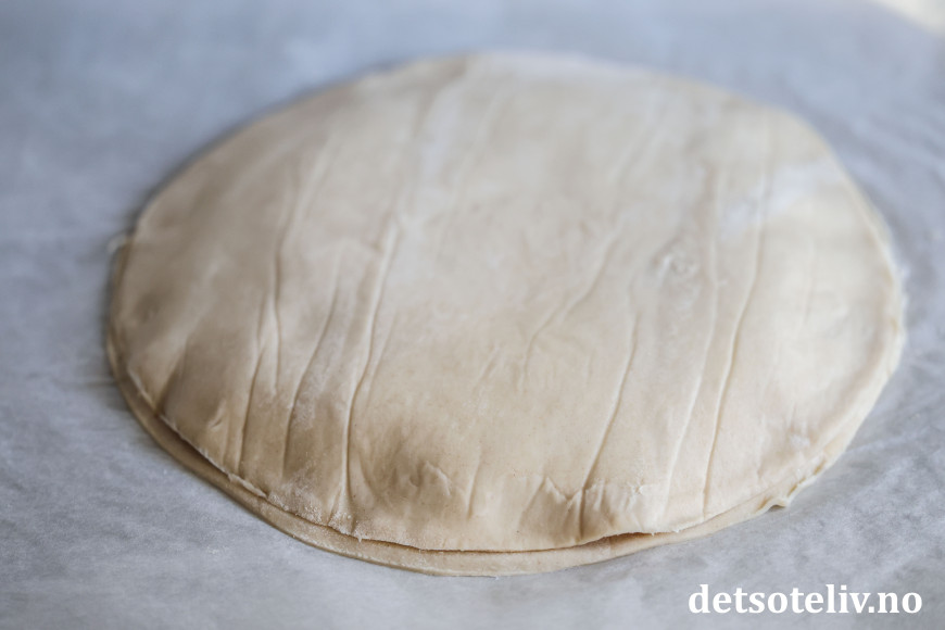 Når butterdeigen er helt tint, kjevles deigen forsiktig litt utover til to firkanter som er akkurat store nok til at du kan skjære ut to sirkler (24 cm i diameter, se tips).