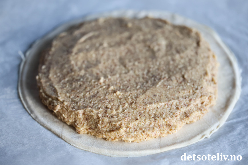 Smør mandeldeigen forsiktig utover i et jevnt lag, men la det være igjen ca. 2 cm kant uten mandeldeig langsmed ytterkanten på sirkelen.