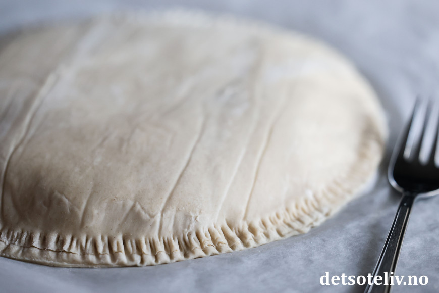 Klem deigen forsiktig sammen langsmed kanten av kaken, og bruk deretter en gaffel til å gjøre skjøten tett.
