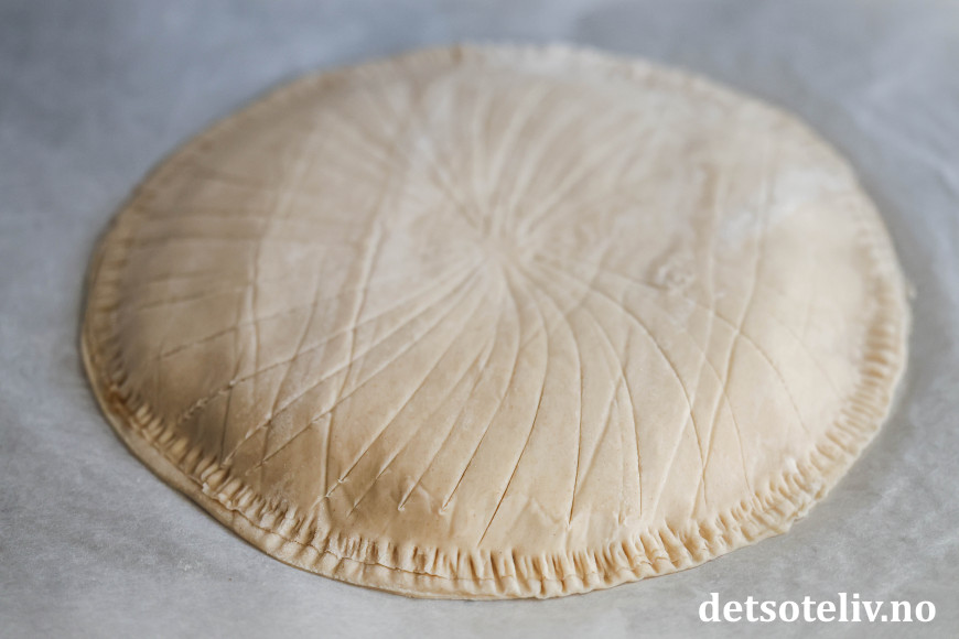 Legg den andre butterdeigsirkelen oppå mandeldeigen (dette gjør du enklest ved å ta tak i bakepapiret og vende butterdeigsirkelen over den andre, før du deretter drar av bakepapiret).