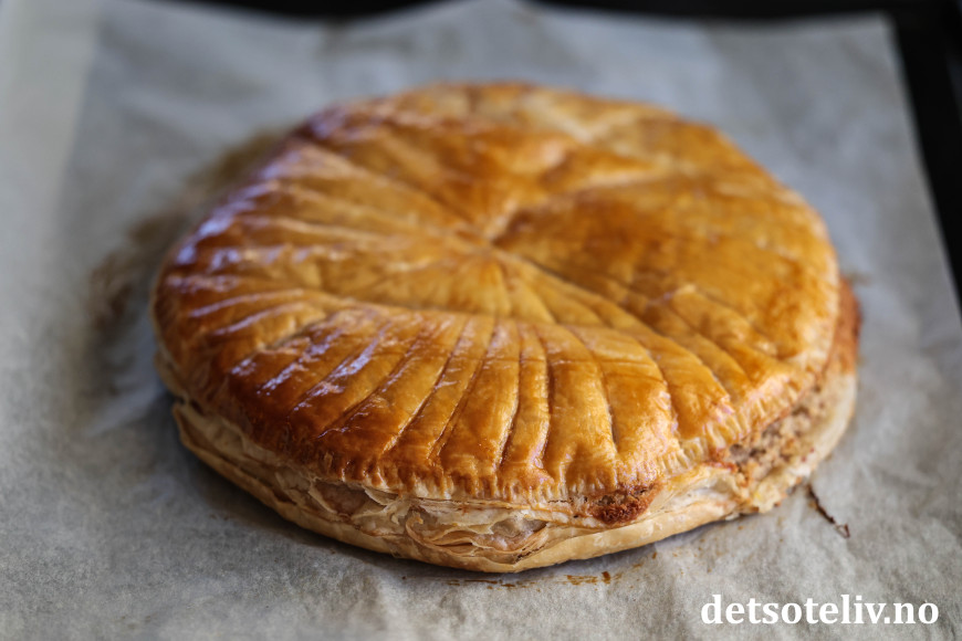 Galette des rois består av sprø butterdeig som fylles med et deilig mandelfyll (frangipane), som gjerne smaksettes med vanilje og litt brun rom.
