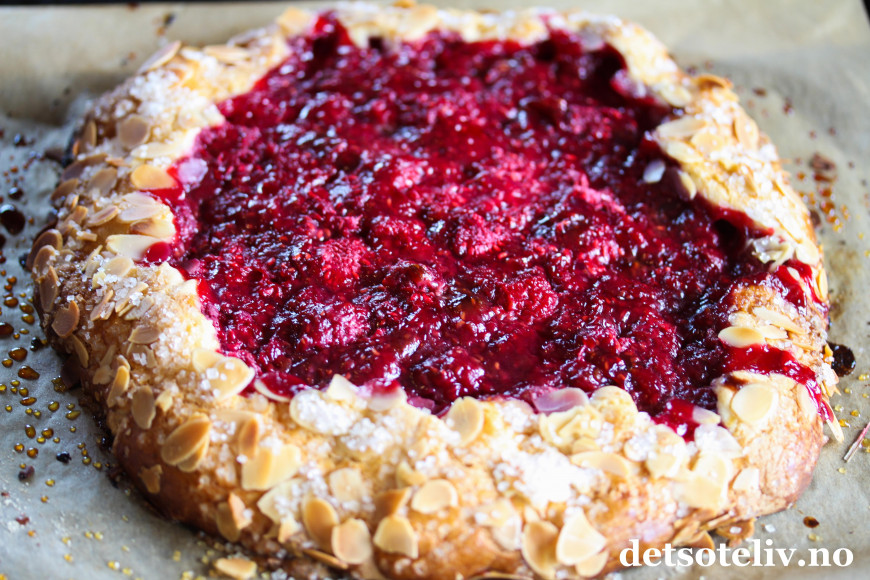 ♥ Det går an å sløyfe syltetøyet under bærene på kaken, og mange lager denne typen kake med bare deig og bær, men jeg synes at bringebærfyllet blir saftigere med syltetøy i tillegg til bærene.