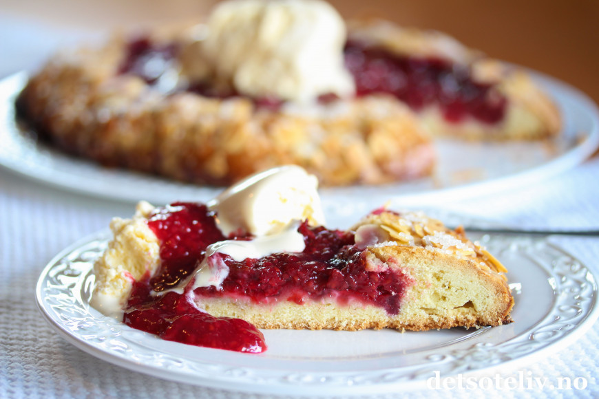 ♥ For å få god smak på kaken, bør du bruke bringebærsyltetøy av god kvalitet og med mye bær (for eksempel syltetøy fra Nora med 60-70% bær). Jeg brukte her dette syltetøyet også ved servering som saus oppå vaniljeisen.