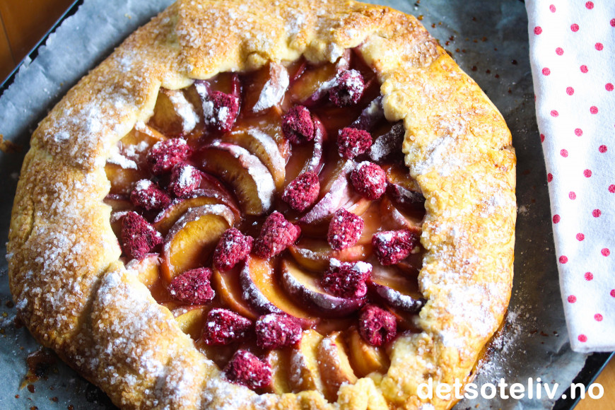 Her har jeg brukt fersken og bringebær for å lage "Galette aux pêches et framboises" - utrolig, utrolig nydelig!