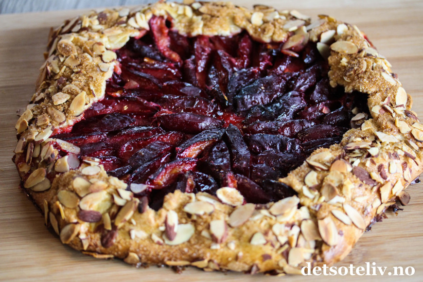 ♥ Jeg bruker ofte syltetøy under frukt- eller bærfyllet i en galette (vaniljekrem og makronfyll er også veldig godt), men denne gangen droppet jeg det og la plommebåtene direkte på mørdeigsbunnen. Til gjengjeld drysset jeg litt ekstra mye brunt sukker over plommene.
