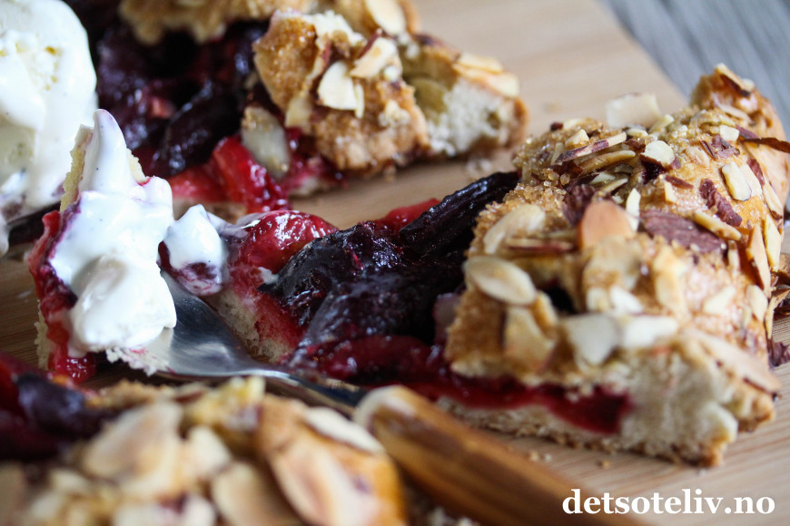For bare noen dager siden postet jeg oppskriften på Pæregalette med valnøtter og honning. I dette innlegget finner du også noen steg for steg-bilder av bakeprosessen. Jeg lagde samme dag også en variant med saftige plommer, som kommer her ("Galette aux prunes" på fransk). Jeg synes mørke plommer ser finest ut, men smaken blir jo like god med gule plommer.