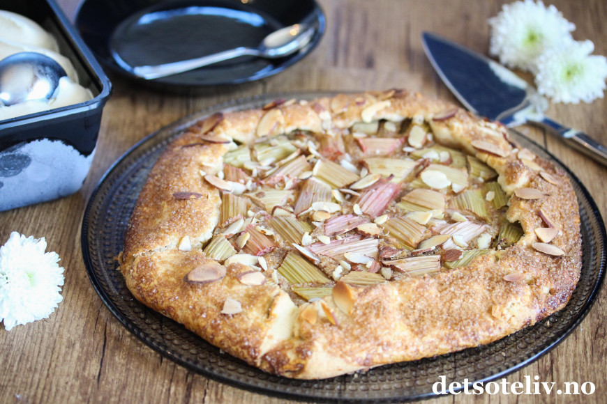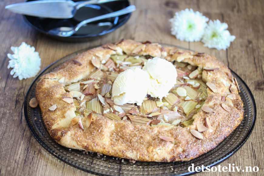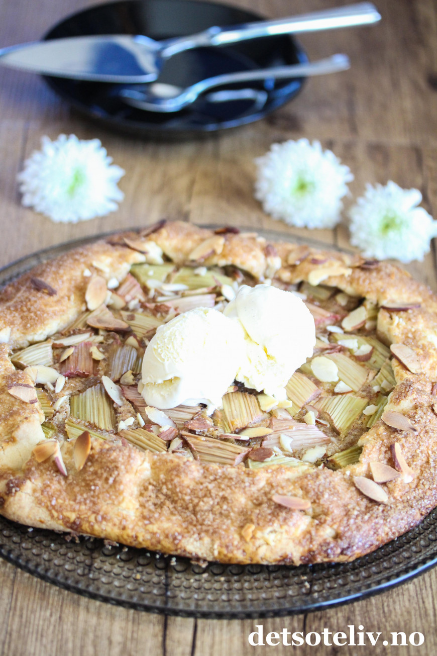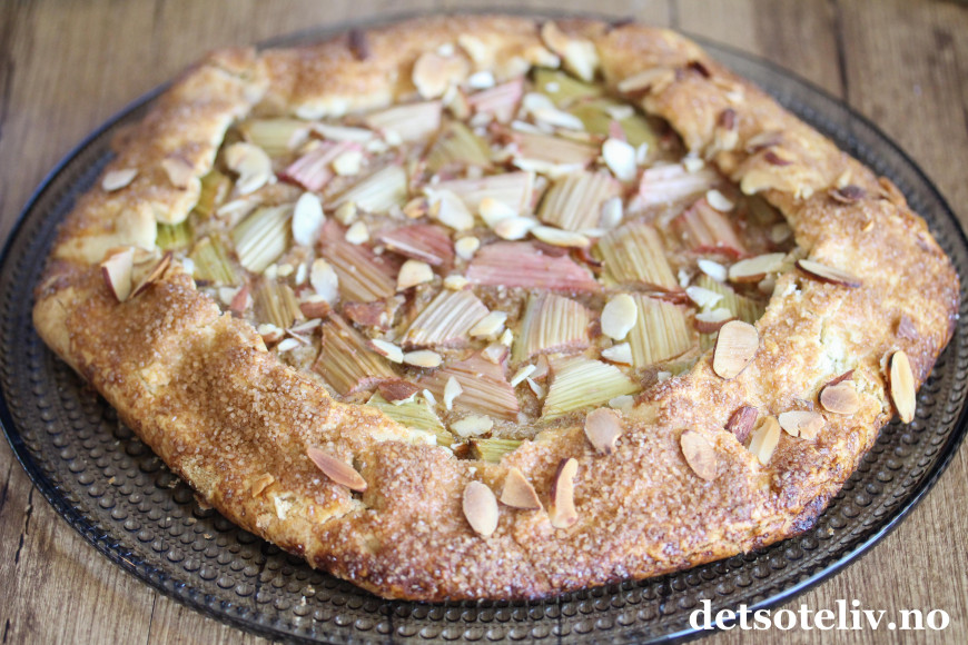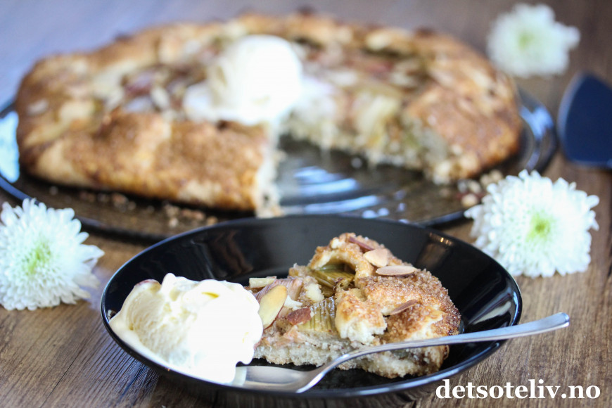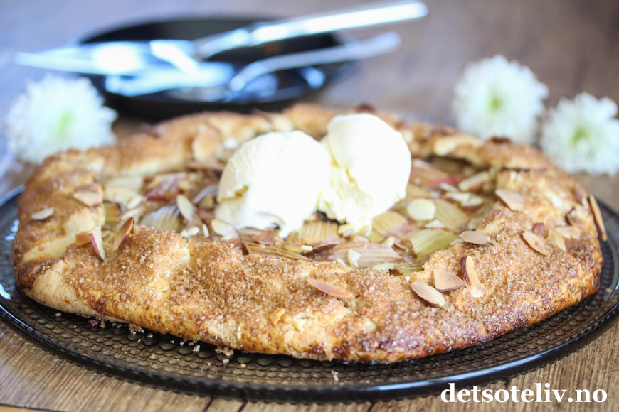 Jeg har bakt med rabarbra igjen, og denne gangen er det en rabarbra-"galette". Galette er en fransk terte som stekes direkte på stekeplaten og som kan varieres i det vide og det brede. Du finner fra før av mange varianter av galette her på Det søte liv (se alle samlet HER), så som du skjønner er dette en kake som jeg synes er veldig kjekk å lage!