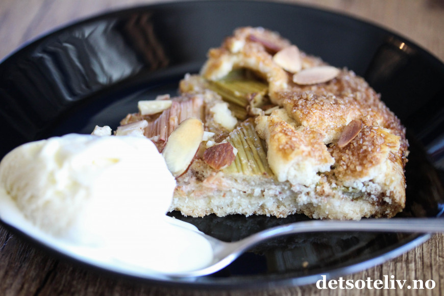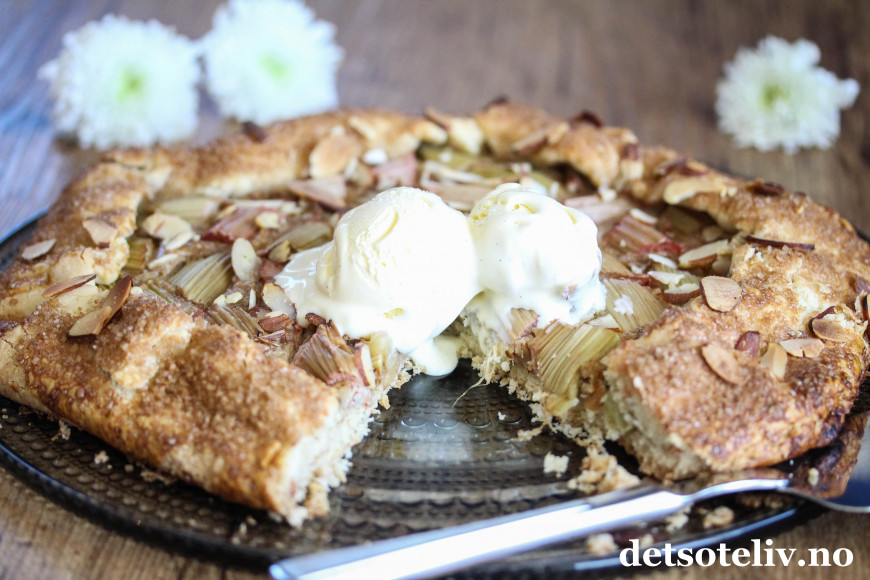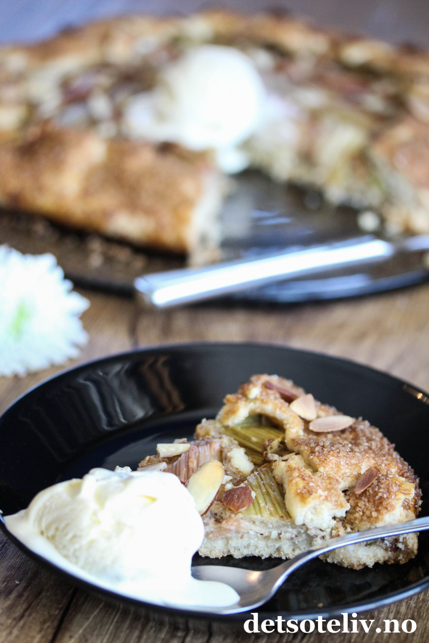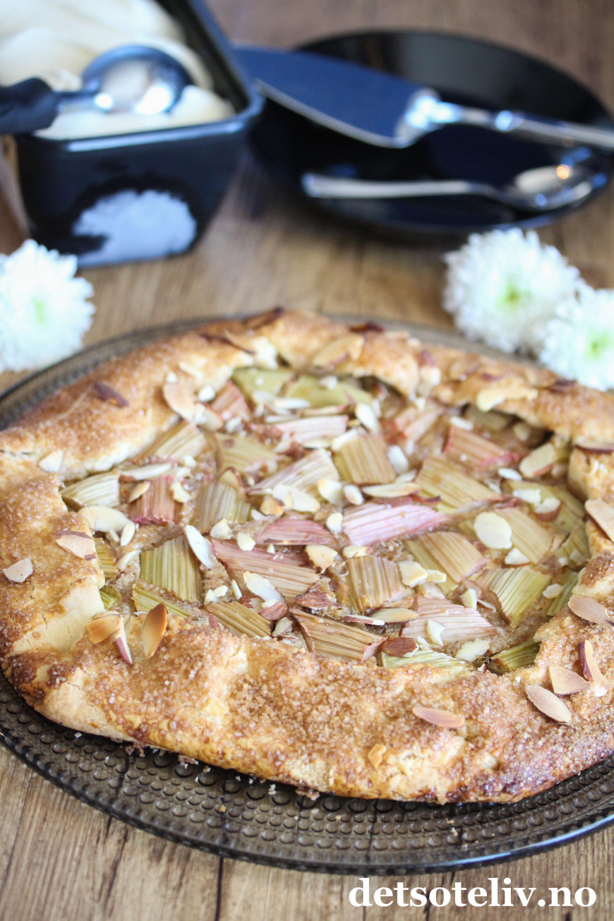 Jeg har bakt med rabarbra igjen, og denne gangen er det en rabarbra-"galette". Galette er en fransk terte som stekes direkte på stekeplaten og som kan varieres i det vide og det brede. Du finner fra før av mange varianter av galette her på Det søte liv (se alle samlet HER), så som du skjønner er dette en kake som jeg synes er veldig kjekk å lage!