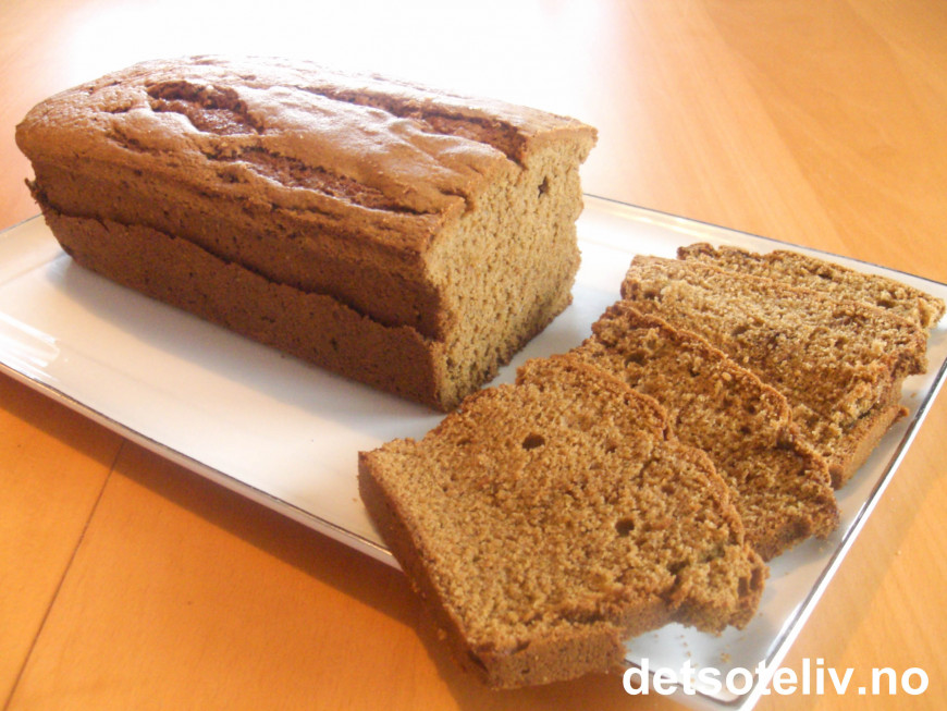 Jeg stekte kaken i en brødform som rommer 2 liter, og da var det bare såvidt at deigen ikke rant over kanten på formen (se bildet). Jeg anbefaler derfor at du bruker en form som rommer 2,5 liter, eller at du bruker to mindre former, for eksempel én som rommer 1 liter og én på 1,5 liter.