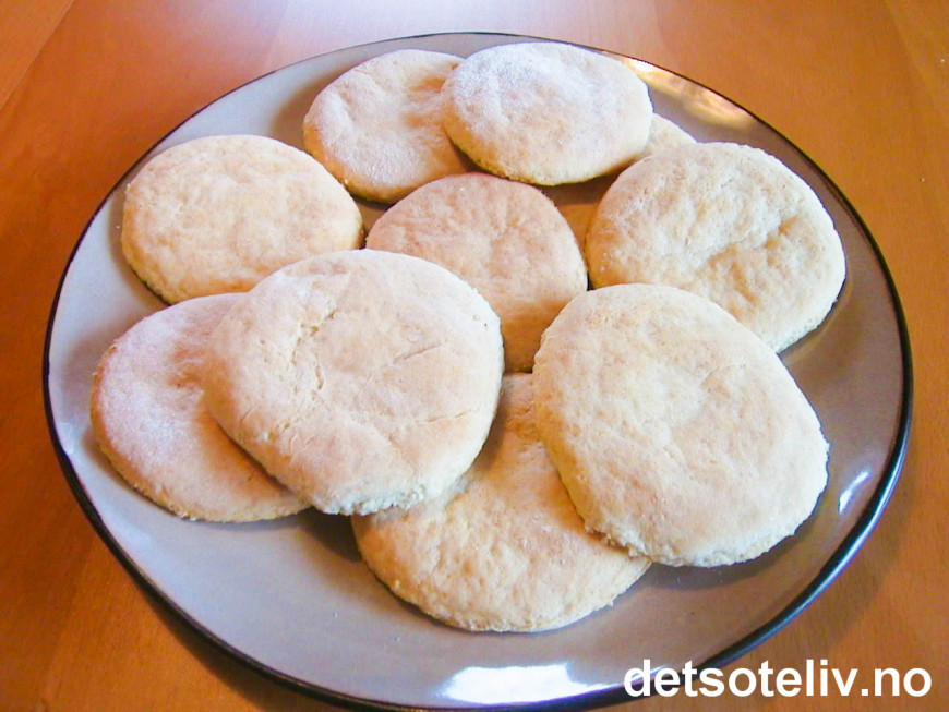 Kjevle ut deigen på lett melet bakebord og stikk ut rundinger på ca 6-8 cm i diameter. Sett dem på bakepapirdekket stekeplater. Stekes midt i ovnen ved 190°C i 10-12 min. Avkjøles på rist.