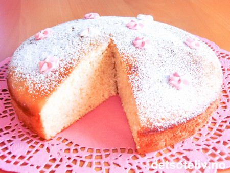 Ha deigen i en rund form (24 cm i diameter) med bakepapir i bunnen. Stek kaken midt i ovnen ved 180°C i 30-35 min. Avkjøl kaken i formen.